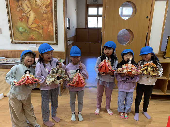 5歳児の女の子は好きなお人形を選んで雛壇に飾りました。